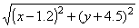 100 PRINT SQR((X-1.2)^2 + (Y+4.5)^2) (Enter↓) (2.4)式(2.3)の表し方を(2.4)のように書き直すのがプログラミングの実践です。この書き方には、Plain_Basicの流儀(文法)が決められていますので、それを守らなければなりません。他のプログラミング言語では別の書き方があります。ここでは、最初の100はプログラム文のラベル(見出しのこと)です。PRINTはコマンドを表すキーワード、SQRはルートに開く関数名、記号^はべき乗を意味します。XとYとに具体的な数値を代入するときには、代入文形式で下のように書いて、GOTO 100と入力すると結果がテキストモニタに書き出されます。例えば、
