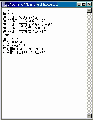 ある数の2乗・3乗・平方根・立方根を計算するのは、すべて、べき乗の演算子^を使って、2,3,(1/2),(1/3)乗で計算できます。2乗と3乗とは掛け算の繰り返しの方が単純です。平方根は、良く使うこともあって、関数SQRを準備してあります。立方根は、専用の関数を特に準備しませんので、1/3乗で計算します。例題プログラムは内部でA=2と設定した計算です。任意の数を計算したいときには、直接モードで、例えば「A=5: GOTO 20」と入力します(図1.1 ex11power.txt)。