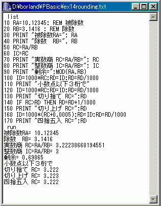 実社会で扱う数は、すべて整数扱いです。小数点の付いた数は、小数点を飾りのように考えて、小数点以下の何桁目かに実質的な単位がある整数として計算します。少し高級な電卓では、切り上げ・切り捨て・四捨五入(up,cut,5/4)の記号の付いた切り換えセレクタがあります。また、小数以下何桁目でこれを行わせるかのセレクタもあって(F,4.3.2.1.0)のどれかを選びます。このような数値の扱いを丸めと言います。お金の単位で、例えばドルはセント単位まであります。ドル単位で表すと小数二桁までの数ですが、二桁以上の表現は使いません。円とドルとの比率を扱うときとは考え方違います。現実のお金の計算では、端数を切り捨てます。衣料材料を準備するときの数値は、必要長さを切り上げた寸法数値の布材を使います。科学技術計算では、最低桁で四捨五入を使います。数の丸めは、実生活で習慣として処理していて意識していないことが多いのですが、数値計算のプログラミングでは、案外面倒なところがあります。例題では、整数型・実数型、整数除算、余りの計算を扱っています。小学校で習う「10割る3は、答3、余り1」の計算は、丸めの概念を使っています。例題は、任意の小数を、小数点以下3桁で丸める計算を示します。(図1.4 ex14rounding.txt)。