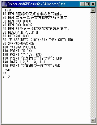 二つの直線の交点を求める問題は、典型的な二元連立一次方程式を解く問題になります。代数式では連立一次方程式をマトリックスで表すことが多いのですが、プログラミングではマトリックス記号を理解する約束が使えませんので、単純な代数式の形で扱います。この例題では、6個の定数を入力データとしなければなりませんが、その入力方法に内部ファイルの読み込み(READ-DATA文)を応用しています。ラベル番号140のDATA文を差しかえると、別の計算ができます。ラベル150を付けた単独のDATA文をプログラムファイルに作成しておいて、MERGE文で読み込ませる方法が応用できます。また、直接モードで定数にデータを代入しておいて、GOTO 70で走らせる方法も使うことができます。