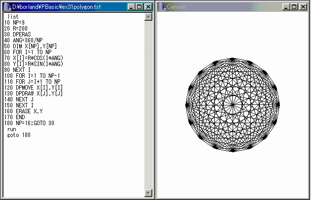 任意の正多角形を作り、そのすべての頂点間を線で結んだ単純な図形です。例題プログラムは、最初九角形を描きます。ラベル番号180で十六角形の設定に変えてラベル番号30から実行させたときの図形が右側のCanvasに作図されています。このプログラムで注目する処理は以下の項目です。