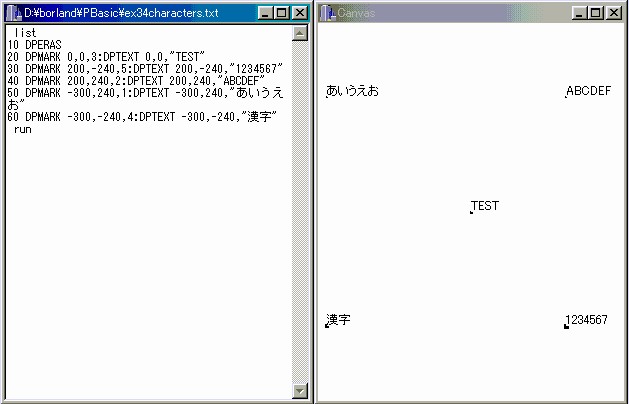 文字列は、先頭文字の左下を指定した座標に合わせて作図します。文字は、システムで利用できるフォントであって、英字・数字・記号、及び漢字を描くことができます。文字寸法の変更は実行モードではなく、直接モードのときに、FONT-GRAPHICSメニューで行います。デフォルトは9ポイントです。 (図3.4 ex34characters.txt)