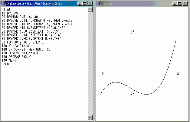 この式は、X=-2でY=-6、X=3でY=14ですので、この範囲をグラフにすると横5×縦20の縦長になります。見てくれをよくするため、横軸を5倍に拡大して作図することにします。そうすると、ウインドウの設定を「 DPWIND 3.5, 10, 25 」とし、(-2 < X < 3)に代えて、X=Z/5の関係に直し(-10 < Z < 15)を使ってグラフを描かせます。ウインドウの設定はデフォルト値と変りますので、続けて別の作図をするときには注意が必要です。NEWコマンドを実行すれば、デフォルト値に戻ります(図4.1 ex41draweq3.txt)。