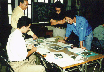 ・各班が撮影した写真のカラーコピーを見て、カラーチップから色を取り出し、4〜8色並べる。このと き、写真の色に忠実なものを探すのではなく、あくまで各色を並べた際にきれいでなくてはならない。