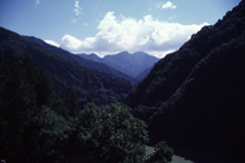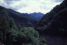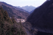 人造湖(秩父湖)の上流らしい、山すそを切り落としたような風景。広葉樹、前景の栗の木が春から夏にかけてふくらむ。