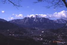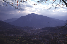 美の山から撮影。秩父盆地、武甲山を望む。近景の枝はサクラ。