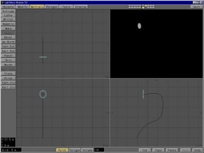 7.胴体を作る 首のときと同様に Polygon→Point でポイントを打ち、 Tools→Makeでカーブを 描き、Layerを変えて、 Object→Discで円を 描いて Multiply→ RailExtを使用し、 円を線に沿って押し出す。 |