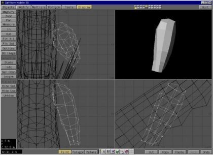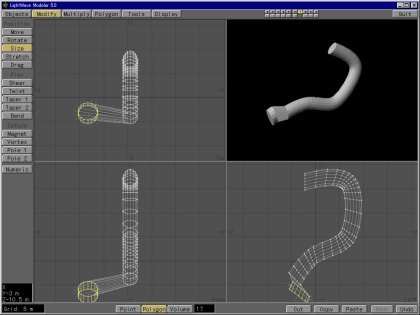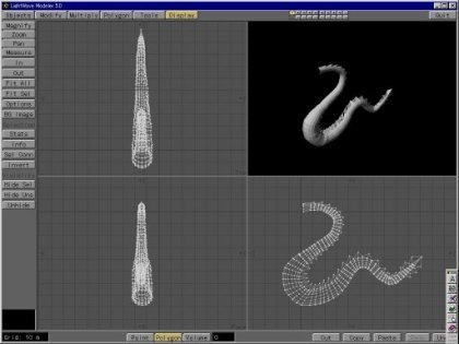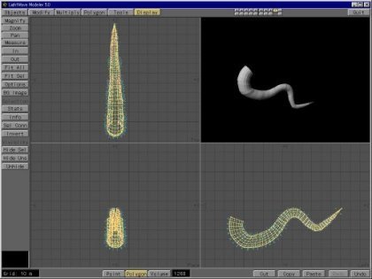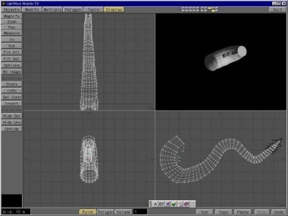 首のときと同様にアンダーバーのPolygonを指定し、胴部の一番上の輪の部分を一列づつ選択し、 Modify→Sizeで大きくして行く、また、尻尾の先になるほど細くし、先端をつぼめる。 |