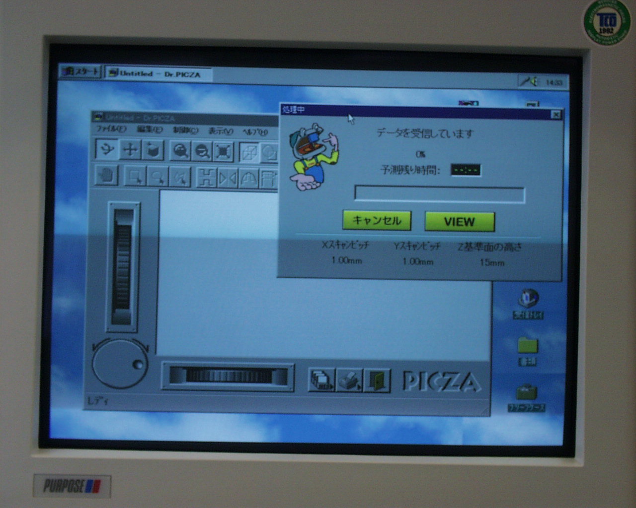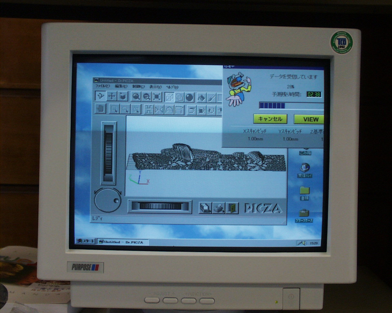 PICZAを利用した形状入力の途中経過をチェックしている様子を示す。 計測に必要なおよその時間がはじめに表示される。粘土の台まで測定していることが分かる。 Z軸だけの計測のために、ヒレの下の部分が計測されていない。