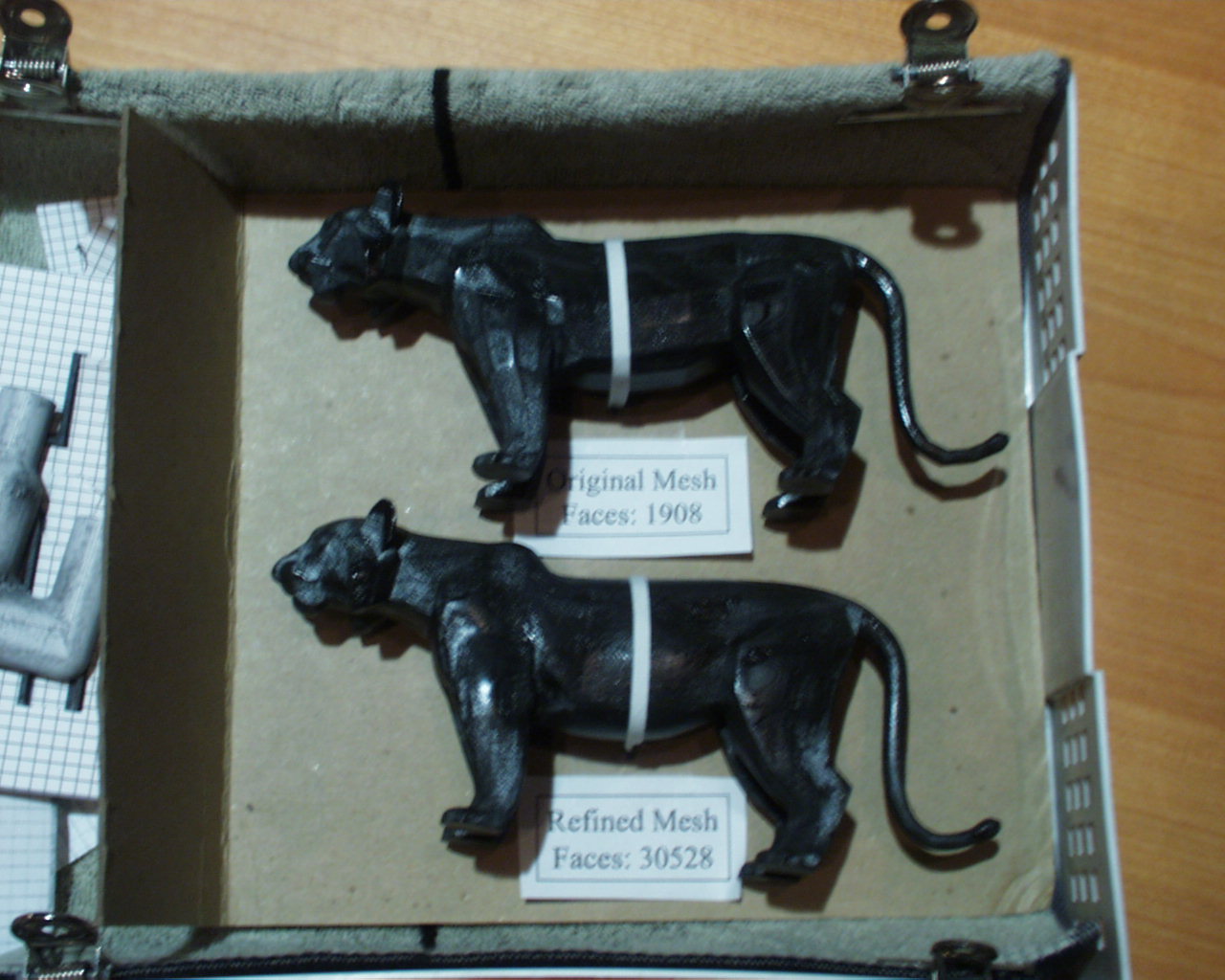 ラピッドプロトタイピングに関連した研究を進めている東京大学の鈴木先生が報告された 紙積層方式の例を示す。トラの例ではメッシュが1908と30528の場合である。トラの大きさを 変更してキャラクタの評価を行ったりできる。一枚づつ紙をめくっていくことによって 形が表れてくる。