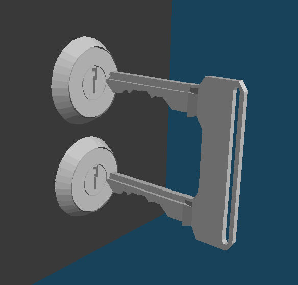 上下に2つ並ぶ鍵穴に合わせて作られた、上下に2つ繋がった鍵。 2つの鍵穴に同時に鍵を差すことはできるが、その状態では鍵を回すことができない。