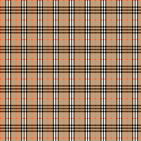 『バーバリーチェック』 言わずと知れたバーバリーチェック。今まで縦横は同じ模様だと思っていたが、調べてみたところどうやら違っていたらしい。なるべく違和感が無いようにストライプの幅を調整した。格子模様なので重なった部分の色が濃くなっており、それを条件分岐で細かく設定してそれらしく見えるようにした。プログラムは、X軸のストライプ、Y軸のストライプ、各ストライプの色と重なった部分の色、と3つに分けて記述したので数値を変えて調整しやすくなっている。