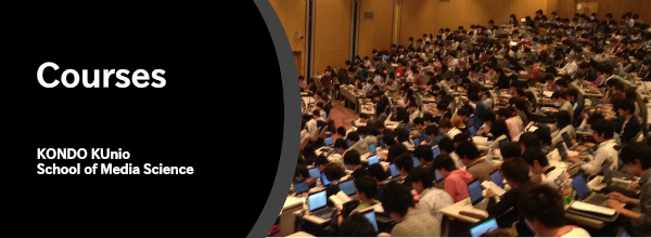 Introduction to Media Scinece メディア学入門,Moodle 2015年度前期開講,1年生向け Basis on Computer Graphics CG制作の基礎,Moodle 2015年度前期開講,2年生向け Introduction to Contents Creation ディジタルコンテンツ創作入門,Moodle 2015年度後期開講,1年生向け Lecture on Contents Creartion コンテンツディベロッピング論,Moodle 2015年度後期開講,3年生向け Exercise on CG Animation CGアニメーション(メディア専門演習) 2015年度前後期開講,2年生後期、3年生前期向け Exercise on Creative Application クリエイティブアプリケーション (プロジェクト演習) 2015年度前後期開講,1,2,3年生向け