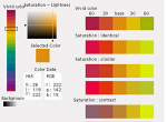 配色を決めるときにデザイナーは、配色理論(角度配色法)を基礎にして、調和する配色を決定しているといわれています。しかし教科書にある配色理論は主に色相を扱っており、実際のデザイン作業では、明度や彩度も考慮したうえで配色を決めているということでした。本研究では、このような専門家の配色作業を分析し、配色理論をもとにして明度や彩度の計算方法を明らかにしました。これによって、基本となる色を指定すると、それをもとにした調和配色の候補を複数提示する手法を提案しました。