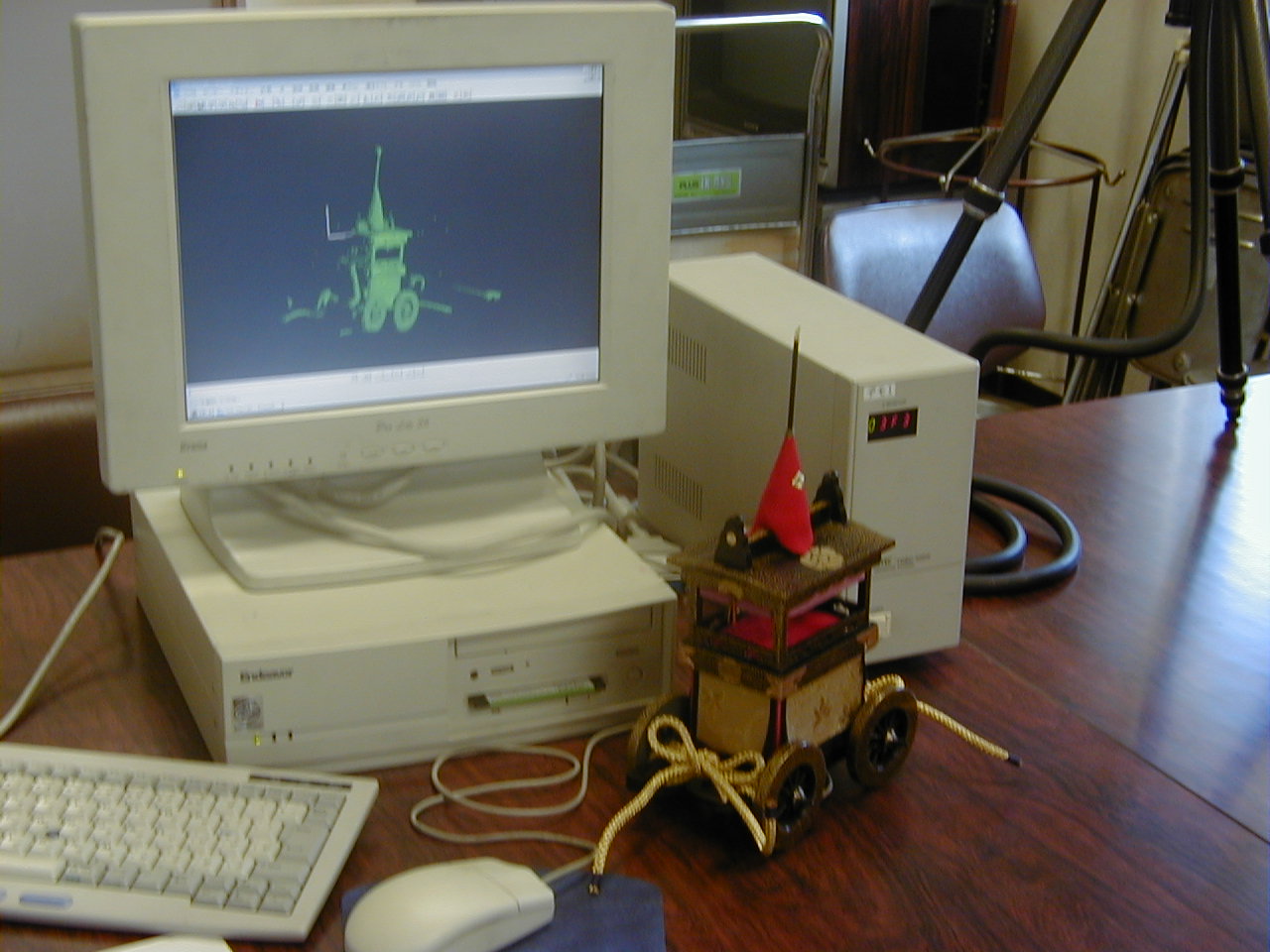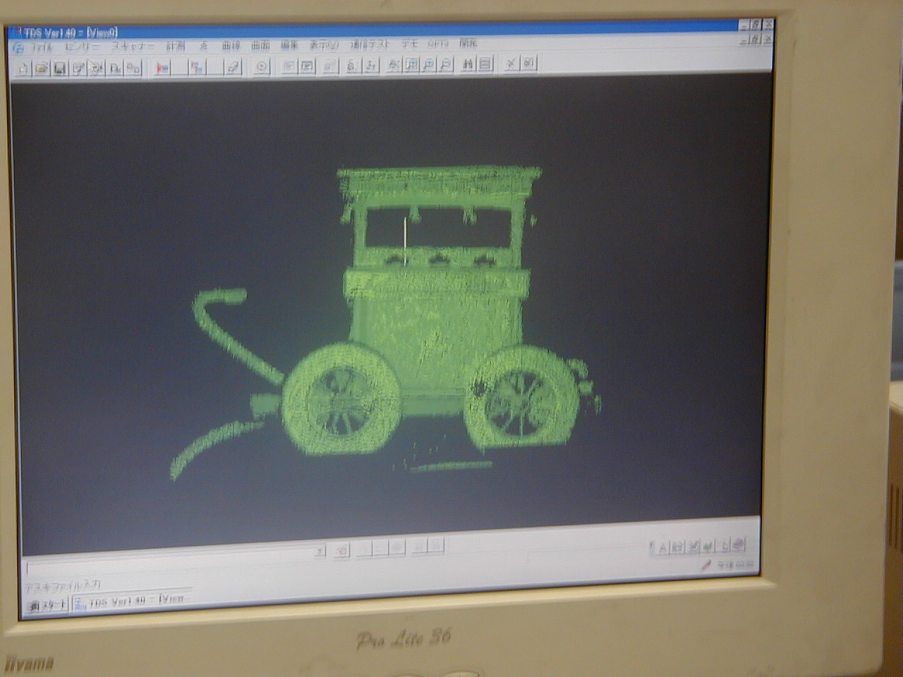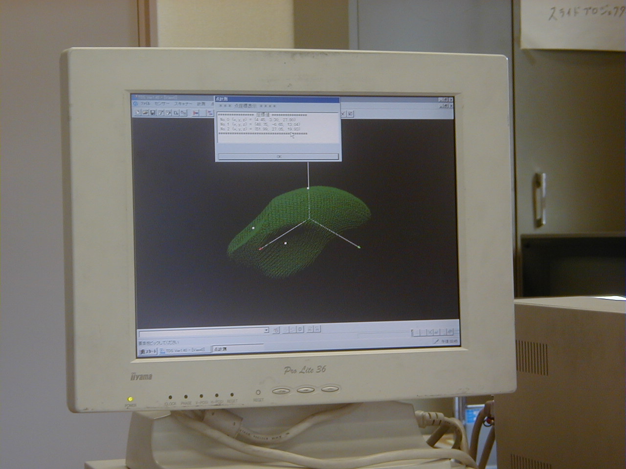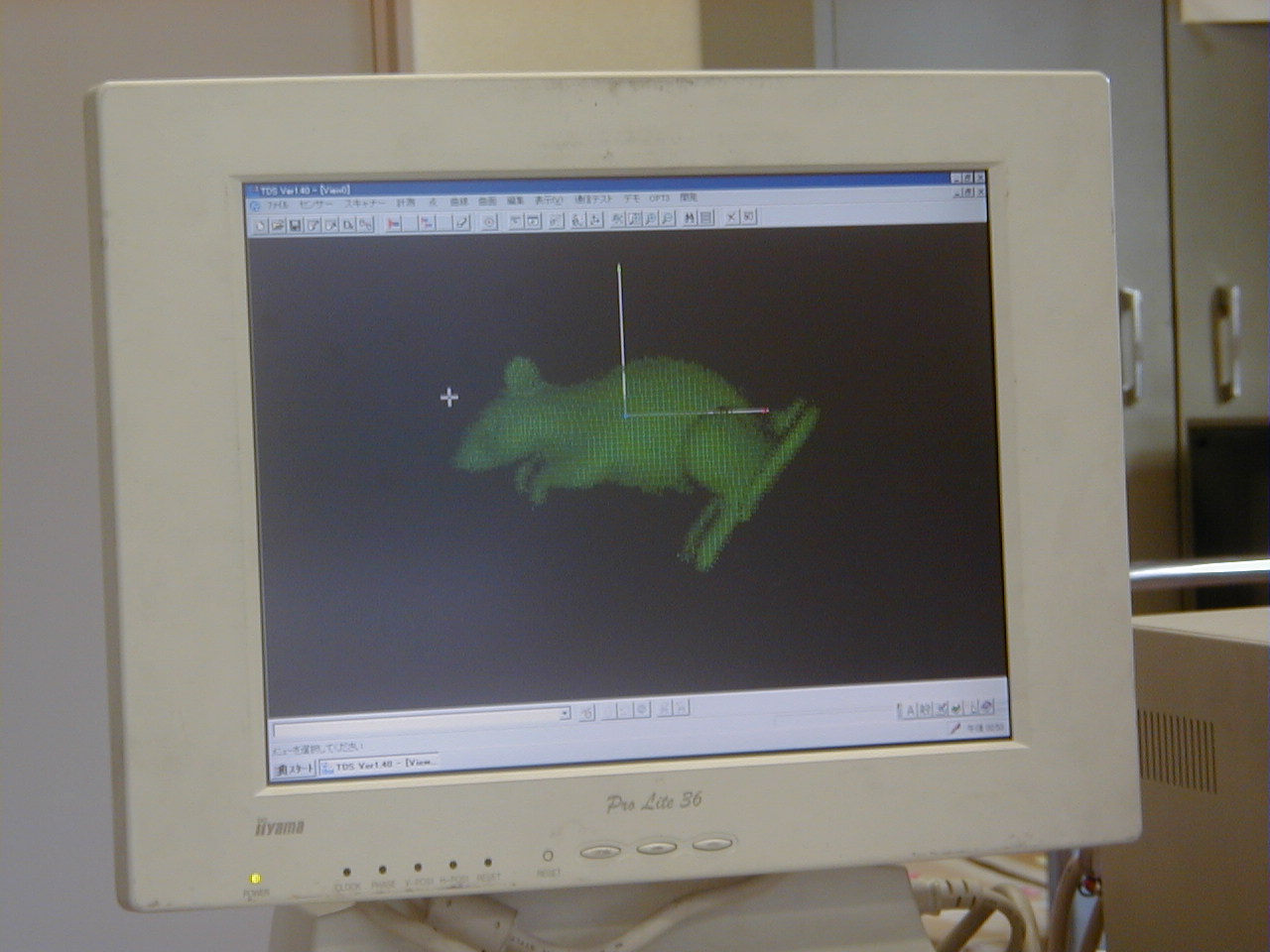 本装置はレーザで奥行きを計測する方式を用いている。この場合は、レーザがあたった場所を計測しているので、レーザに対して平行になっている場合は計測できない。一方向からは容易に形状を入力できるが、全方向の計測結果を一つにするためには、別途アプリケーションが必要であり、デモンストレーションでは行うことができなかった。