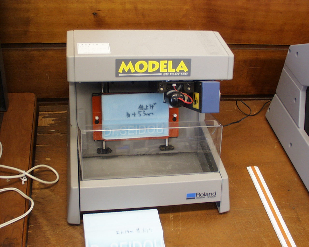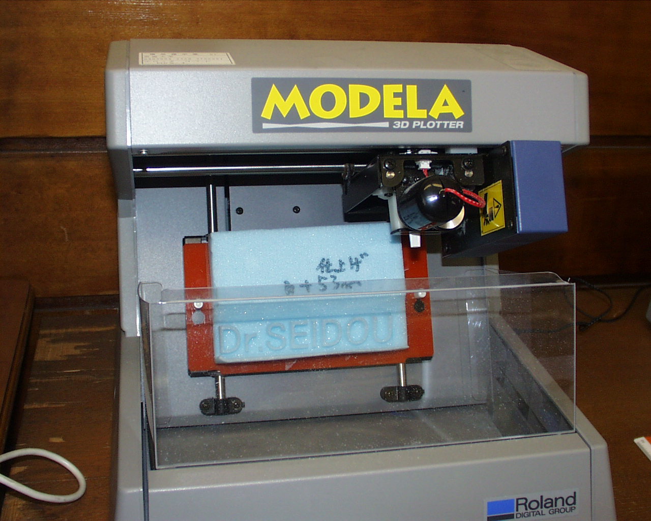 以下の3次元モデルは、3次元モデルを製作するためのMODERAを利用して 文字を切削した例を示す。このようなモデルを加工するためにも 数時間から8時間近くかかるということである。